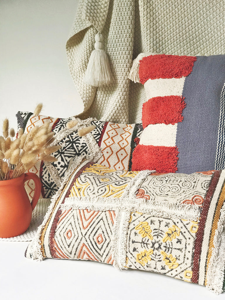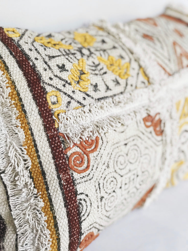 100% Cotton Lumbar Pillow Cover with a hand-block print design and tufted details (pillow cover only - no insert). Plain canvas back.