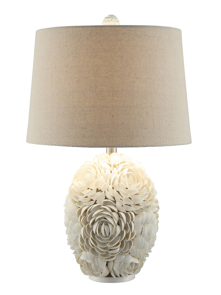 A table lamp featuring an intricate rosette design made of real scallop seashells. Perfect for your beach house, cottage or resort style interiors. One (1) bulb socket.